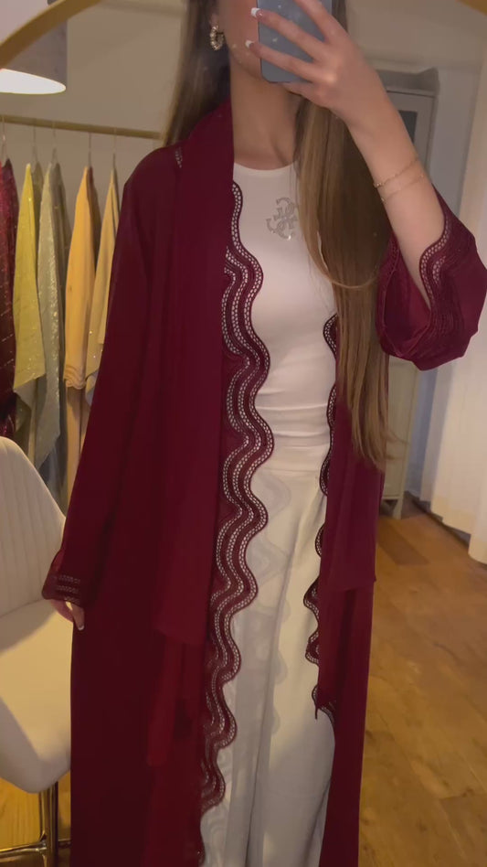 An elegant, flowing abaya designed with delicate intercut wave lace detailing. The...