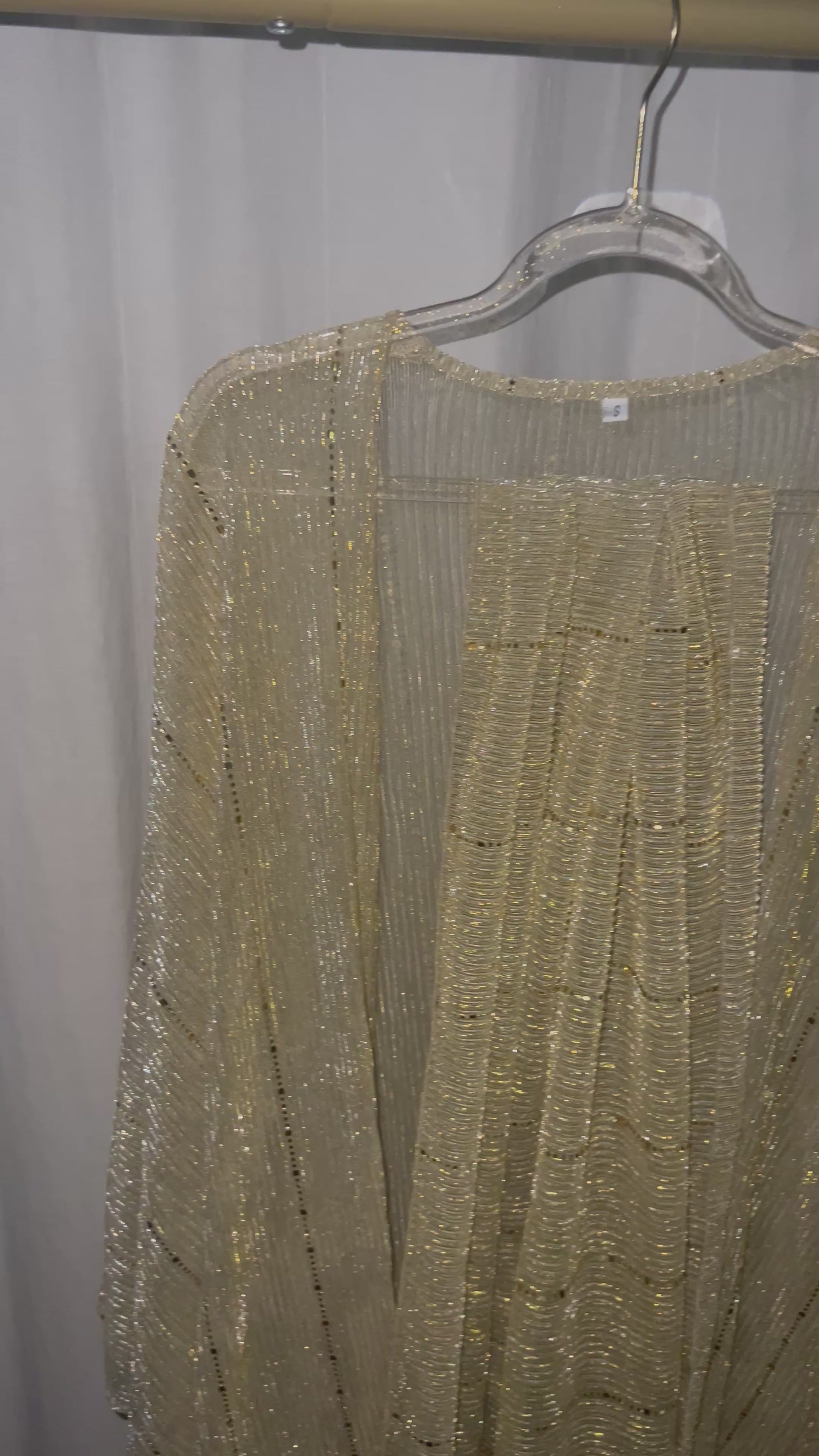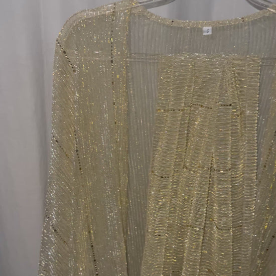 The Aliyna Abaya is a stunning sheer evening abaya, featuring gold foil detailing on shimmering fabric, elegantly paired with a matching scarf.